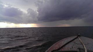 Уплыли на противоболожный берег озера. Попали в атмосферный фронт. Поднялся шторм. При размерах озера 40 х 8 км это не буря в стакане.