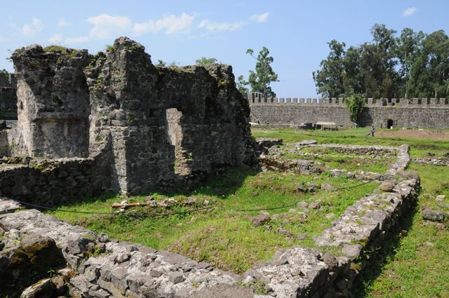 Сначала мы видим остатки стен, сложенных из больших темных каменных блоков, затем, метра через три, высокая стена из светлого камня, за ней через метр – еще одна стена из небольших темных камней. Первая стена предположительно византийская. Она строилась очень серьезно, ресурсами всего края. Блоки вырубались где-то в карьерах и доставлялись на место. Стена толстая, башни квадратные, очень серьезные. Прослеживается имперский размах.