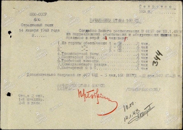15.11.42 Численность полка 452 человека. Из них 238 артиллеристов и минометчиков. Ударная сила 214 человек. В стрелковых батальонах числится всего 50-60 человек, при штате более 300. Батальоны включают лишь по одной укомплектованной наполовину стрелковой роте вместо трех. При этом полк недавно закончил пополнение и в столкновение с противником еще не вступал.