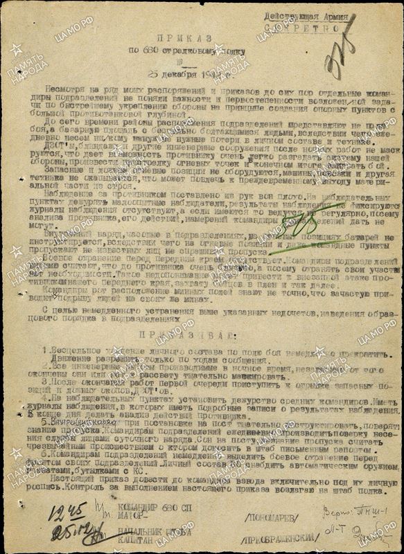 25.12.42 полк сообщил в штаб дивизии об окончании инженерного оборудования участка обороны. Одновременно командиром полка устроен разнос всем подразделениям.