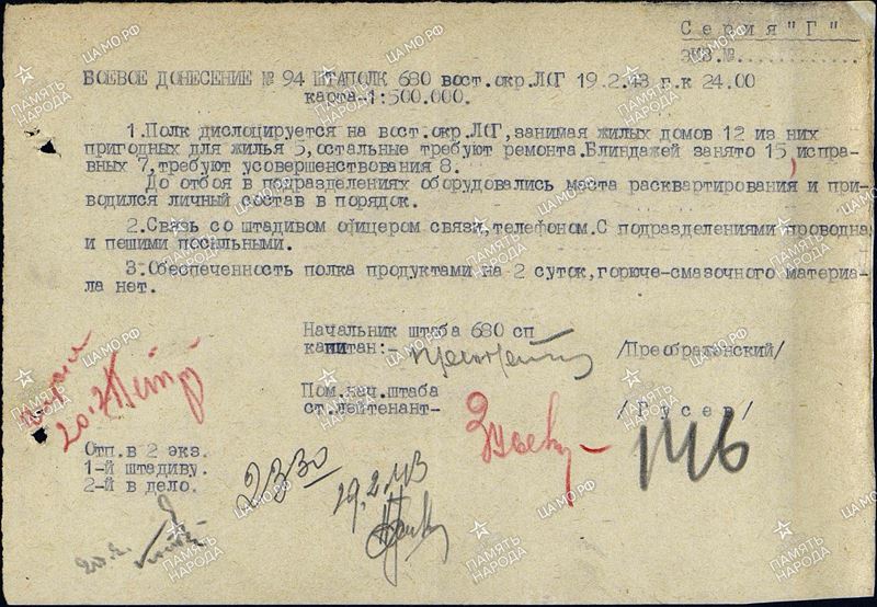 С 1 по 16.02.43 полк находится в том же месте в районе Самофаловка и занимается подготовкой.
